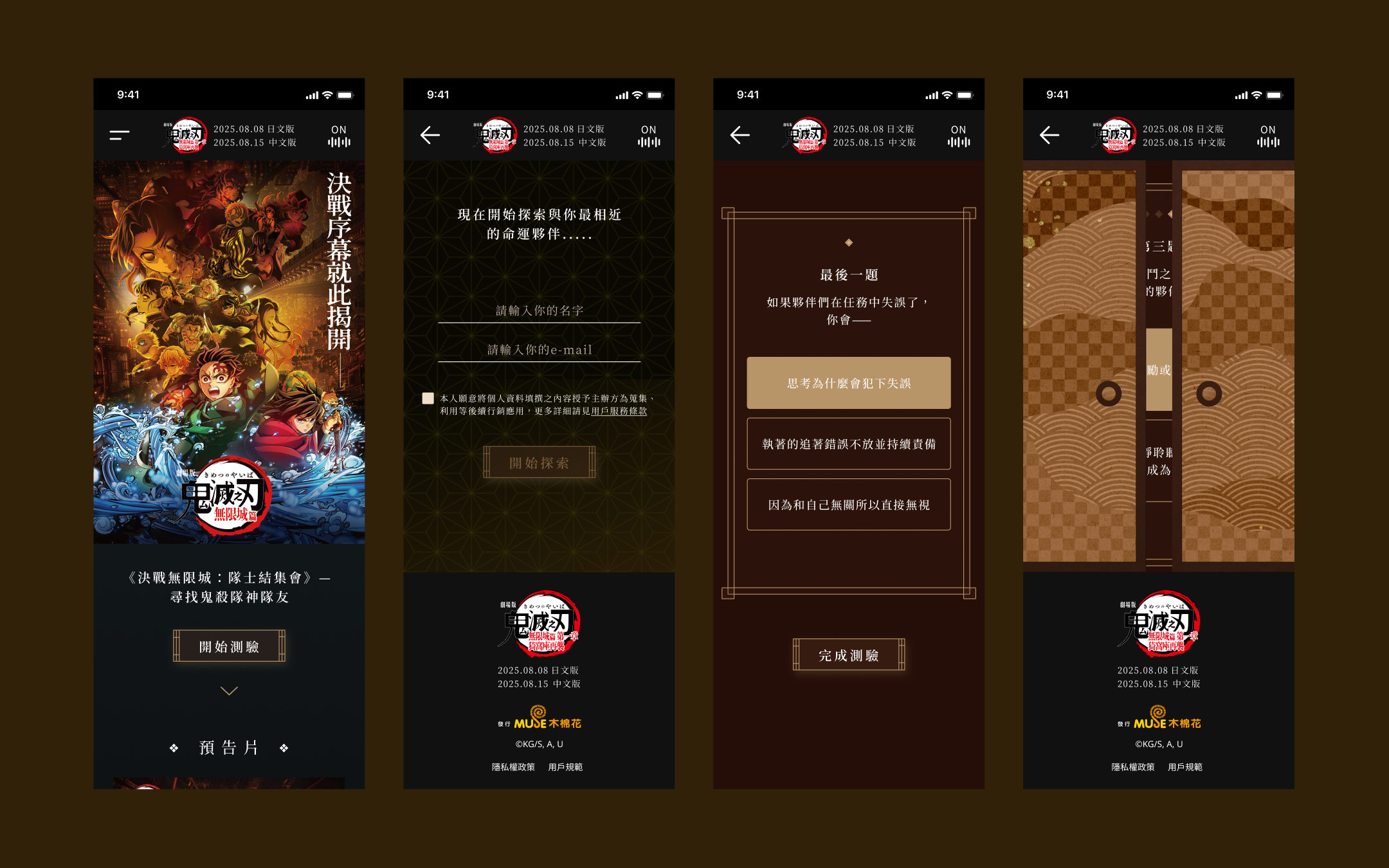 為了符合既有的故事設定,維持角色個性與劇情邏輯的一致性,團隊將測驗問題依據三個面向「自我成長、戰鬥風格、情感表現」來設計。用戶透過不同情境問題作答,最終獲得最契合的鬼殺隊角色,精準對應角色的性格特徵。