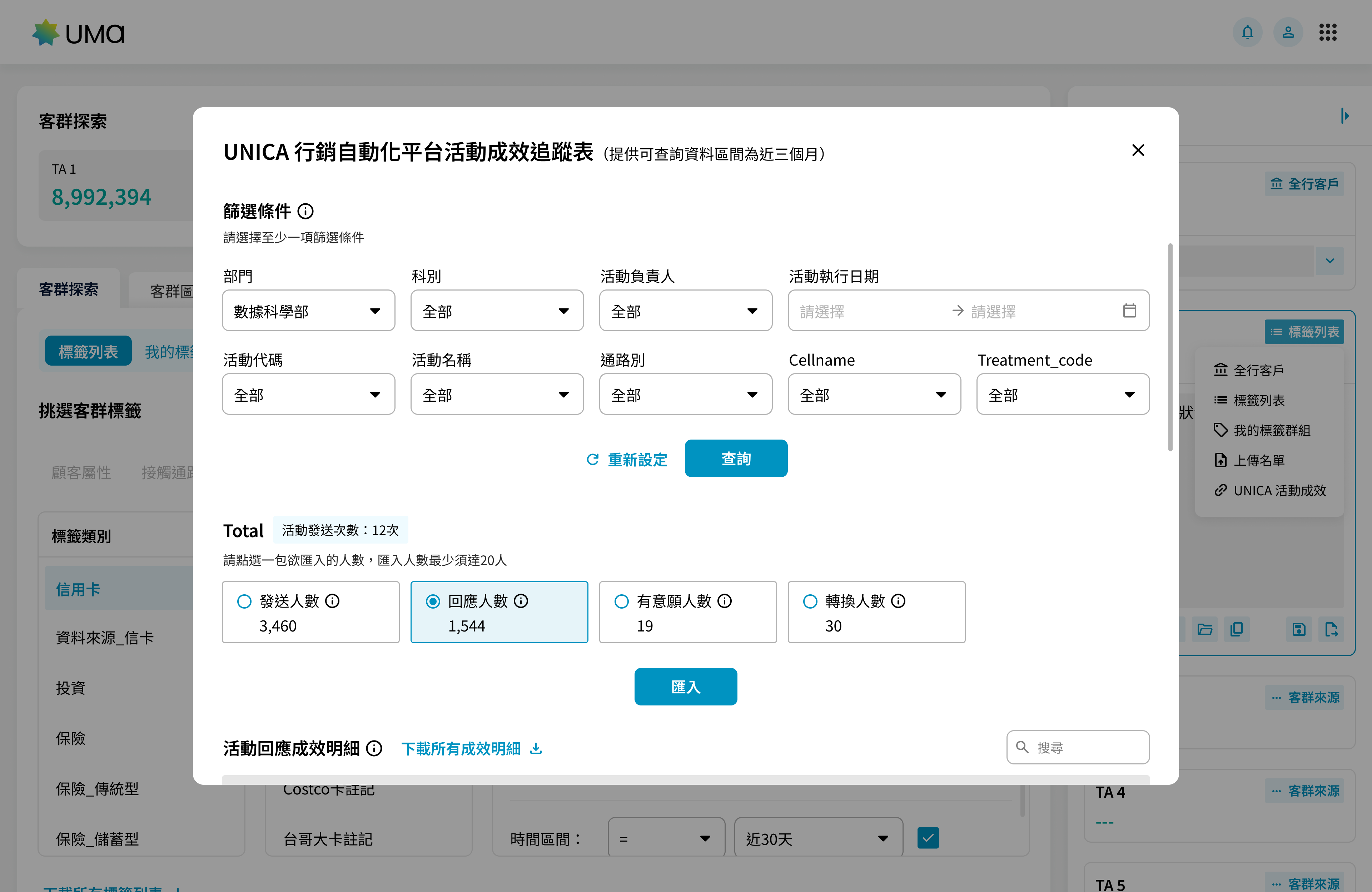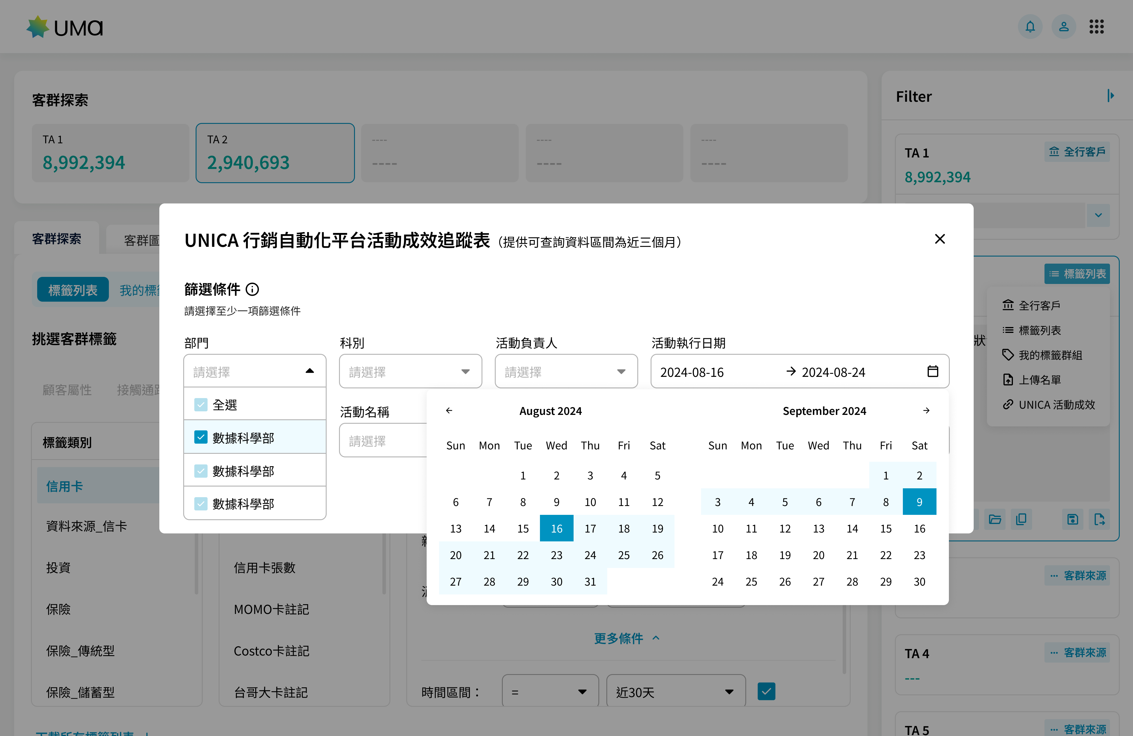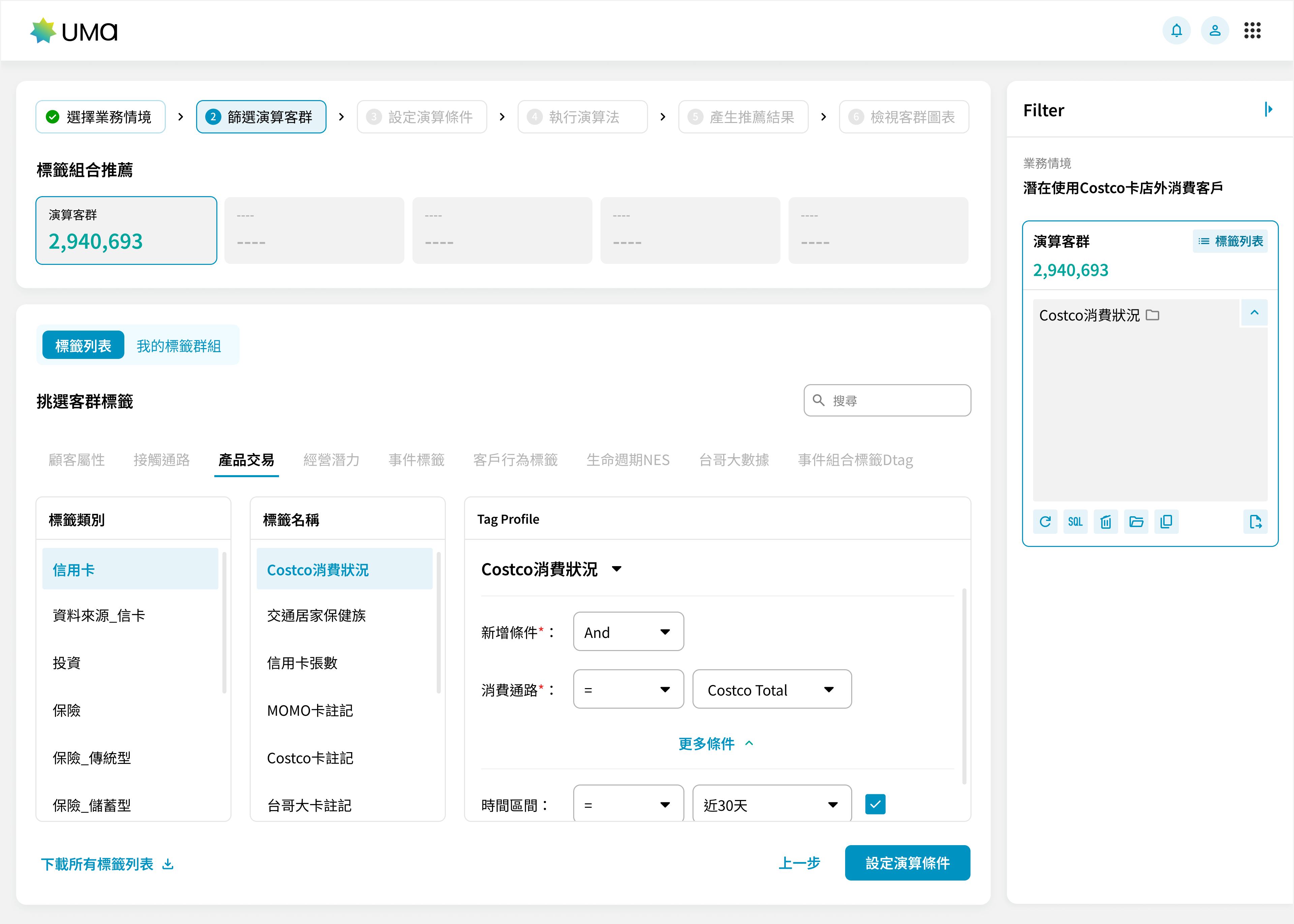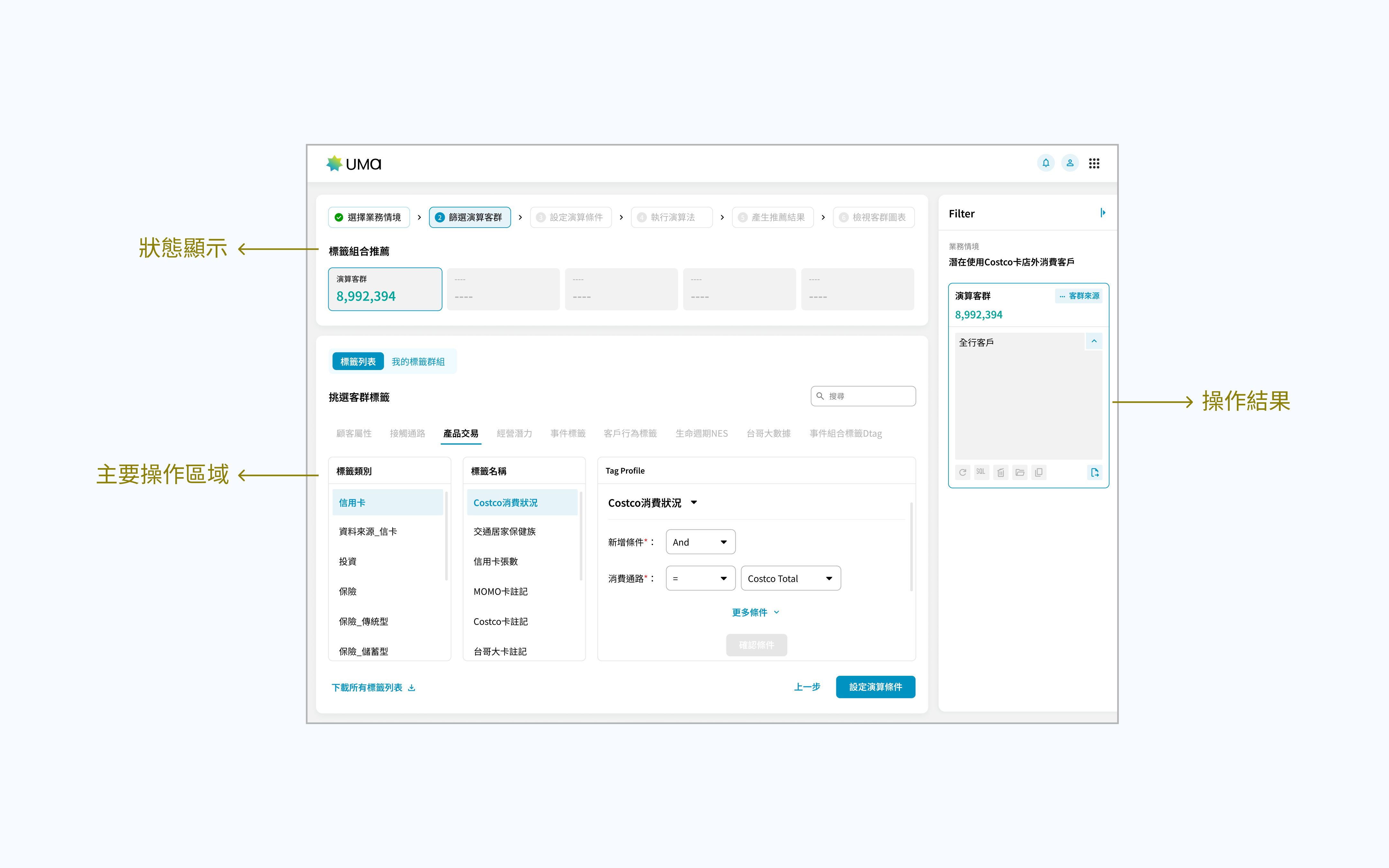 全新的 UMa 以更清晰的視覺與更完整的流程重新被定義。資訊被重組、路徑更明確,使用者不再需要在多個頁面之間穿梭,就能完成過去繁瑣的設定流程。無論是篩選客群、設定條件,或是在結果頁中查看資料分布與趨勢,都能在統一的資訊架構下完成。